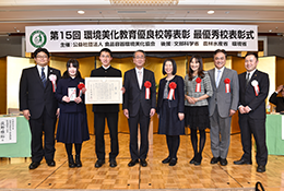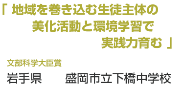 明治20年に創設された同校は、県内で最も古い歴史と伝統を生かしながら、地域に根差した美化やリサイクル活動に積極的に取り組んでいる。とくに、盛岡さんさ踊りの祭り期間に実施する「地区合同清掃」は、住民や近隣の小学校と連携して行う美化活動で、昨年は500名余りが参加した。一大行事にもなっているこの取り組みは、生徒会の組織の一つ、地区生徒会が中心になって計画を立て、地域へ清掃協力依頼をし、関係団体と数回の打ち合わせを経てから行われる。環境美化を通じて住民と交流の機会を設けているのが最大の特徴で、地域の活性化につながり、小学生の良い手本にもなっている。同時に、「森は海の恋人」や間伐の体験学習など、学年ごとに環境への理解を深める総合的な学習「SHEL学習」を展開。毎年実施するエコシンポジウムやエコ学習では、生徒会組織のエコ委員会活動と連動させながら環境テーマを決めて開催する。不要なものは買わないリフューズを意識した4Rも推進し、日常生活の中で環境を思いやる心が育っている。