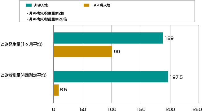 ごみの発生が多い場所をAPの対象としているため、導入後の「発生量」もAP地の方が4倍と多かった。発生抑制効果の有無は検証できませんでした。