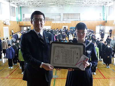 『このたびの優良校 協会会長賞の受賞、誠におめでとうございます。平成25年から活動を続けられ、地域の方々にも喜ばれているということで、誠に感心しております。また、こうした地域を守る活動は、当協会としても誠にありがたいことです。今後もこの活動を継続し、さらに発展できるよう、頑張ってください。このたびは誠におめでとうございました。』