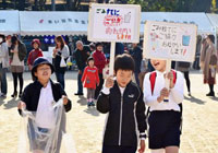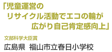 通学路や近隣にある地域の憩いの場「春日池公園」の清掃活動に、住民、青少年育成協議会などと連携して取り組む。単に散乱ごみを回収するだけではなく、ごみを分析することで地域環境に主体的に働きかける実践力を養っている。また、福山市の環境事業「ふくやまエコトライアスロン」とリンクしながら、児童が校内で宣伝と運営を担う空き缶などの回収にも励む。同時に、福山エフピコリサイクル工場など企業の協力を得て知識を深めるかたわら、楽しみながら美化活動を実践。さらに、近隣エリアの小・中学校に取り組みを発信し、地域に輪を広げている。地元の文化祭では、ポスターなどを作成し、ごみの分別、リサイクルの大切さを呼びかけるなど、地域の一員として積極的に啓発活動を展開。いずれも、学年に応じたテーマで総合的な学習や各教科を連動させながら、学校を核にし た地域、企業、行政と協働の視点で環境教育に取り組み、社会に貢献する力を養っている。