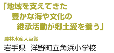 長く続けてきた角浜小学校の伝統行事「磯掃除」が表彰されて、とてもうれしいです。角浜の海は、県の特産物のウニやアワビが採れ、私たちにとっても自然環境について学ぶことができる大切な場所なので、これからも豊かな海を守っていきたいと思います。