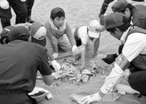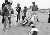 日本海に沿って白浜が続く庄内浜。その近くに位置する同校では、庄内支庁や酒田海上保安部と連携した浜中海岸漂着物調査を1999年から開始。「しおかぜ学習」と名付けて、主に4年生が総合的な学習の時間を使って、地域環境について学習している。海岸に広く点在する埋没・漂着物は、ペットボトルやビニール袋などに細かく回収分別し、過去と比較しながら調査を進めているのが大きな特徴だ。ごみの多さに憂慮した児童は、看板を設置してポイ捨て防止を呼びかけたり、地域行事等で調査結果を発表したりして地域へ広く訴えている。もともと美化意識が高く、1965年から全校児童による海岸清掃活動を継続して実施。通学路クリーン作戦や親子資源回収にも取り組む。その様子に触発された住民たちの参加も年々増加し、地域ぐるみで環境問題に立ち向かう姿勢が整っている。