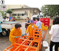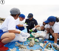 4年生が中心となって取り組む「浜中海岸漂着物調査」は現在も継続して行われており、海上保安庁や庄内総合支庁の協力のもと、より地域に根差した環境学習を展開している(①)。さらに、全校児童による庄内浜クリーンアップ作戦は、開始当初よりも認知度が高まり、地域住民や団体、地元企業など徐々に参加人数が増加(②)。砂浜がきれいになることで美化意識が磨かれるだけではなく、他の人のために働くことの大切さや、住民との触れ合いなどを通して地域の良さが実感でき、ふるさとへの愛着が芽生える行事に発展している。長年続いている年3回のPTA主催で行う資源回収にも、児童は積極的に参加して親子で分別意識を養っている(③)。