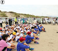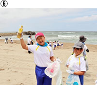 「裸足で歩ける安全な海水浴場にしたい」「夕日が真正面に見える浜中の海が大好きです。これからも大切にきれいにしたい」「浜中の海ごみを全部拾ってきれいにしたい」・・・。庄内浜クリーンアップ作戦を行う際の、児童の力強い意気込みだ。願いが叶う日まで児童の奮闘は続く(⑤)。