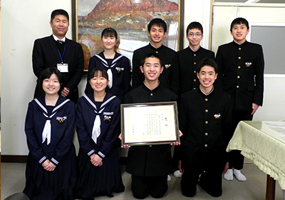 『20年に渡り学区内の清掃活動を生徒が主体となって,保護者や地域との連携により実施してきた活動が評価され,大変うれしく思います。今後も環境にやさしい地域づくりに貢献していきたいと考えています。』