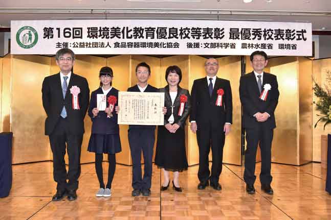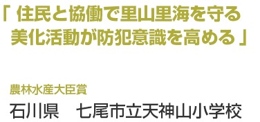 七尾城跡が残る城山のふもとに位置し、七尾湾に注ぐ 大谷川が近くを流れる同校。以前の大谷川の下流はごみ が散乱して濁っていたが、地域が一体となって清掃活動 を行うことでごみが減少してきた。その取り組みの一つが 「大谷川クリーン大作戦」。児童が、住民と協働で川周 辺に散乱している空き缶やペットボトルなどを分別しな がら回収する活動で、毎年300名以上が参加する。「城 山クリーン大作戦」も地域全体で行う取り組みで、資源 ごみの回収などに励む。こうした児童と地域が連携した 活動が広がりを見せる中、その土台となった大切な取り 組みが「健全パトロール」だ。地域団体と6年生の児童 が月2回、通学路をパトロールしながら資源ごみを回収 する活動で、これをきっかけに、ごみのポイ捨てが減少 しただけではなく、犯罪件数も大幅に減るなど、防犯意 識向上にも一役買っている。2011年、能登の里山里海 は世界農業遺産に認定された。児童は、スーパーなどに 手づくりの環境ポスターを貼るなど、美化活動に励みな がらふるさとを愛しむ心を養っている。