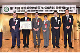 美しいサンゴが群生する海に、天然記念物のヤッコソ ウが自生する山、絶滅危惧種に指定されているシマド ジョウが棲息する川など、希少な自然に囲まれた同校。 その環境を守るために、児童は年間を通して地域と連携 した美化活動に取り組んでいる。海では、海岸清掃を行 い空き缶やペットボトル、漂着ごみなどを回収・分別。住 民に聞き取り調査を進める中で、水質の悪化などが原 因で海中のエダミドリイシサンゴが減少していることを 知った児童は、漁業関係者の協力の下、折れたサンゴの かけらを石に固定する移植作業をスタートさせた。海の 環境を通して、自然がつながっていることを実感した児 童は、山や川にも着目。山では、林業関係者の協力を得 て、ドングリを採取し、山に植樹している。川において は、同校の前を流れる宍喰川の水質・生き物調査を行 いながら、状況を把握し分析する。その結果は、環境新 聞などにまとめて図書館などに掲示しふるさとの魅力を 発信。美化活動を通じて、児童には宍喰の豊かな自然 を受け継ごうという心構えが培われている。